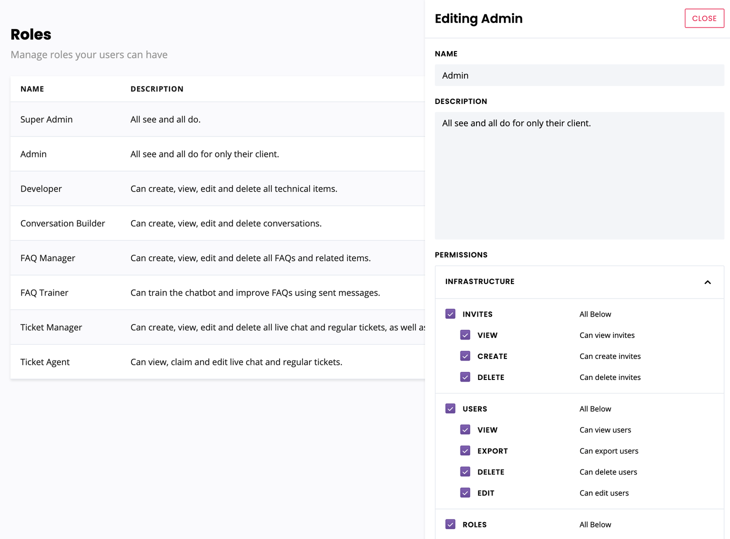 We’ve added seven built-in roles to the platform, including live chat agent, FAQ trainer, developer, and more. These roles should allow you to hit the ground running, assigning them to the members of your team.