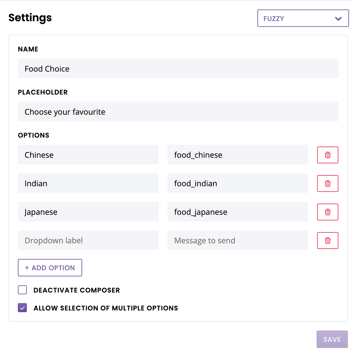 By popular demand, we’ve adding multi-selects on fuzzy composers. The multi-select allows a chatbot user to select multiple options from a dropdown.