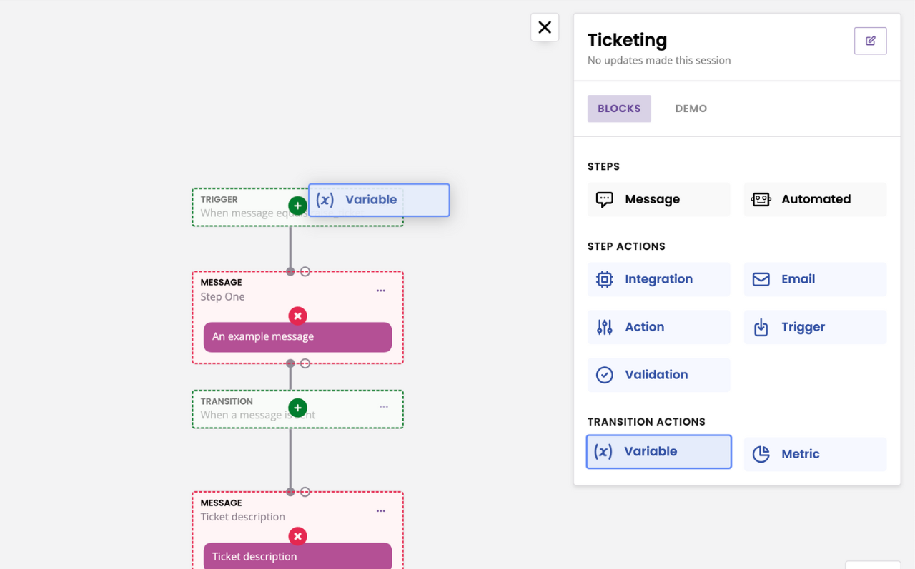 visible element information on the canvas such as variable name, integration name, action description, and more.