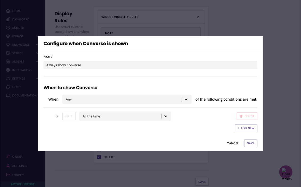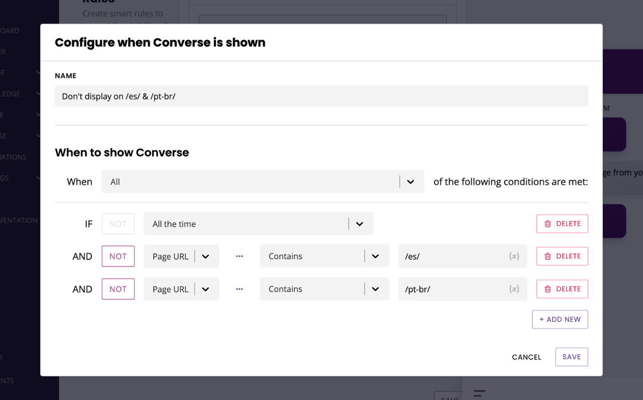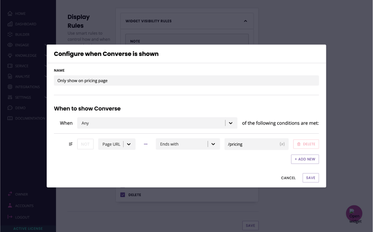 You have an incredible amount of control over your chatbot widget. Using the visibility rules, you can control where and when, to a very precise degree, you want your users to see (or not see) it.
