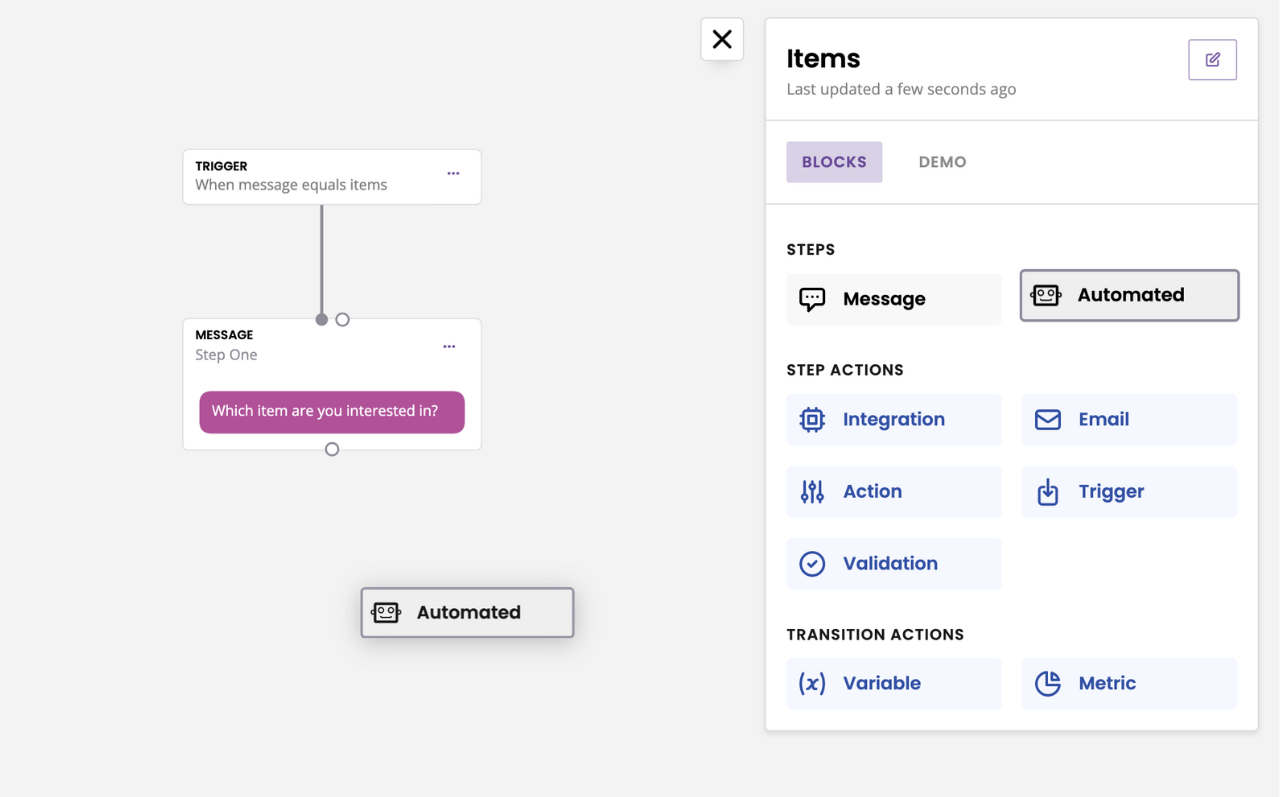 Leave the automated step empty. We’re going to use this step to store the item the user has entered into a variable and trigger the branching.