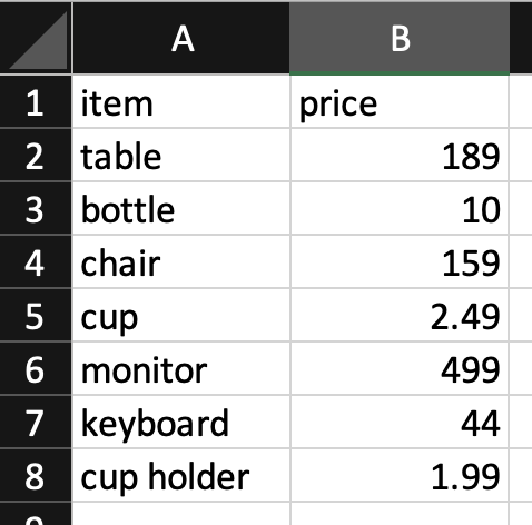 For this tutorial, let’s pretend we have a long spreadsheet of items and their associated prices