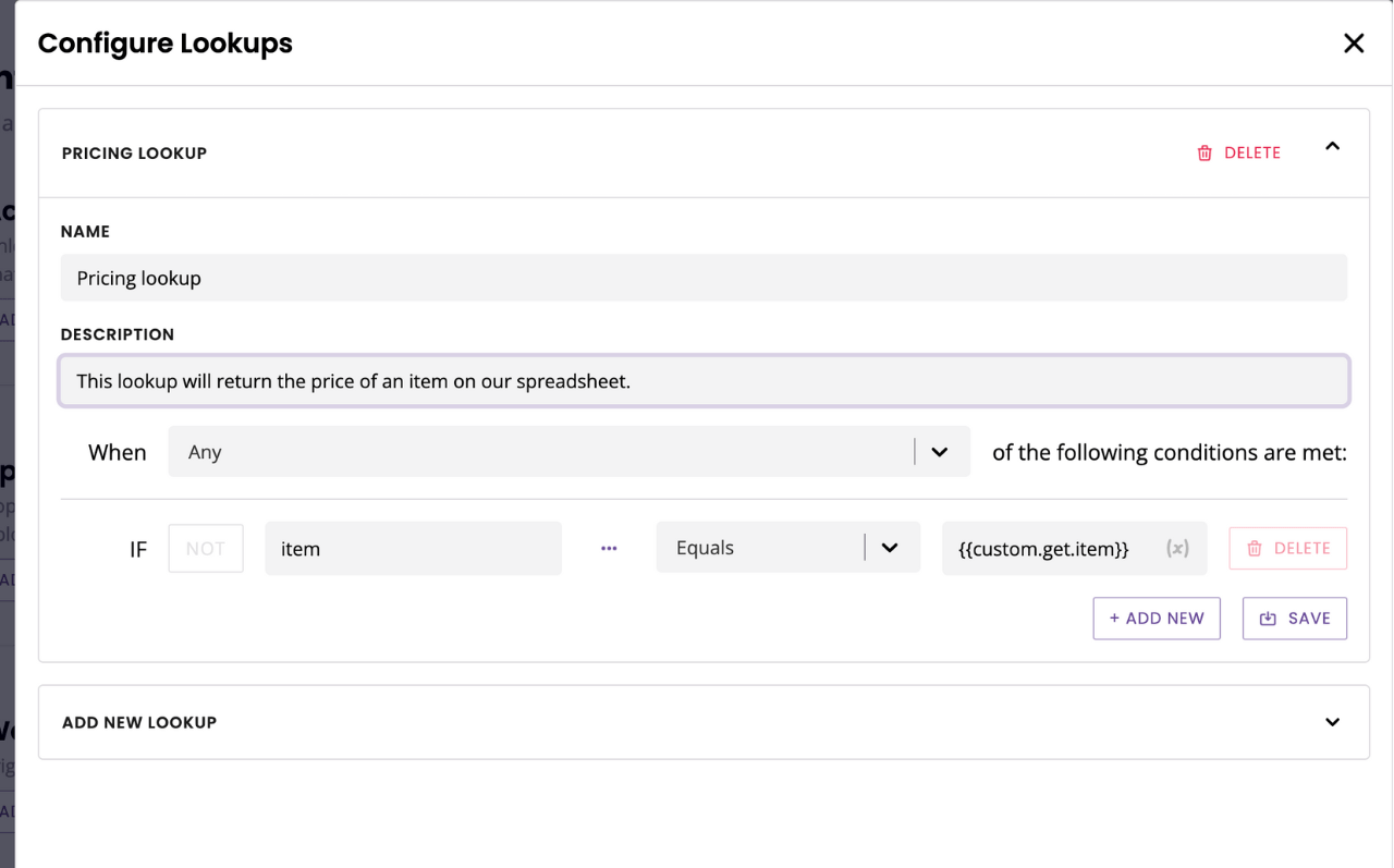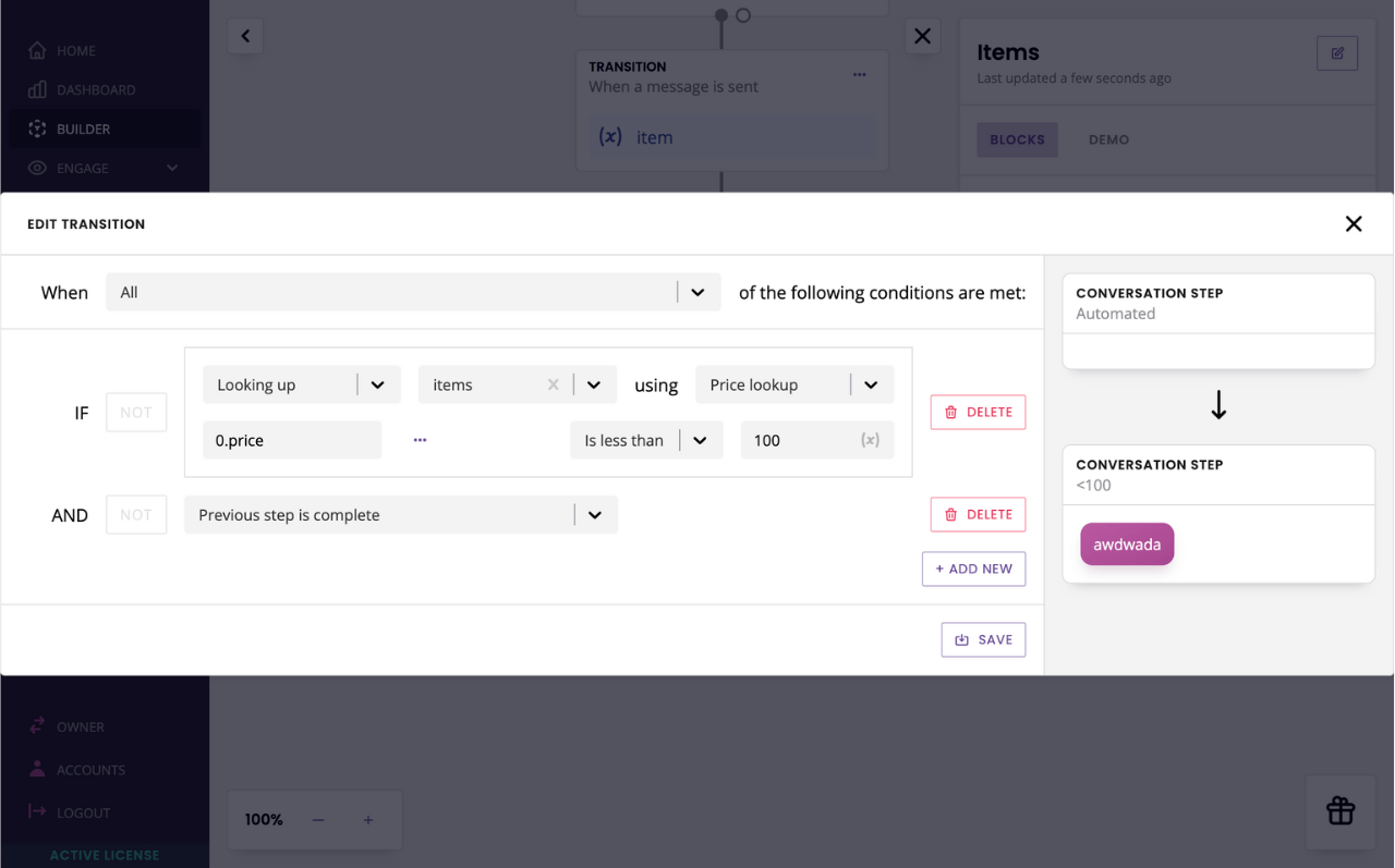 itemsis the name of your spreadsheetPricing lookupis the name of your lookup0.priceis the first pricing result matching the item picked by the user100is the value we’ll compare the price toPrevious step is completeensures we only transition to the result after branching
