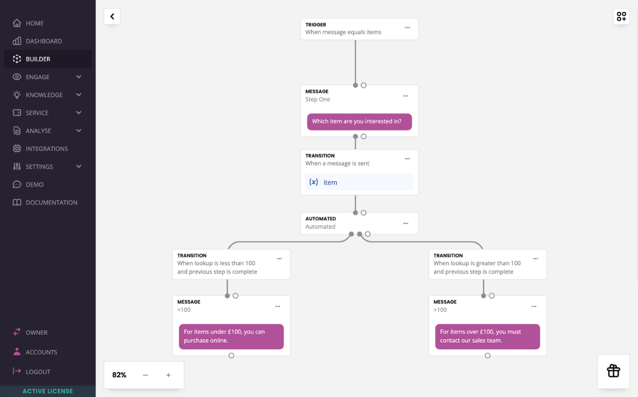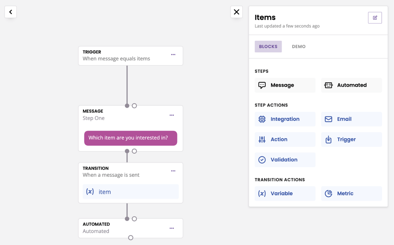 We want the chatbot to ask the user which item they’re interested in purchasing. Then, depending on the price of the item, we will send the user down two different paths.