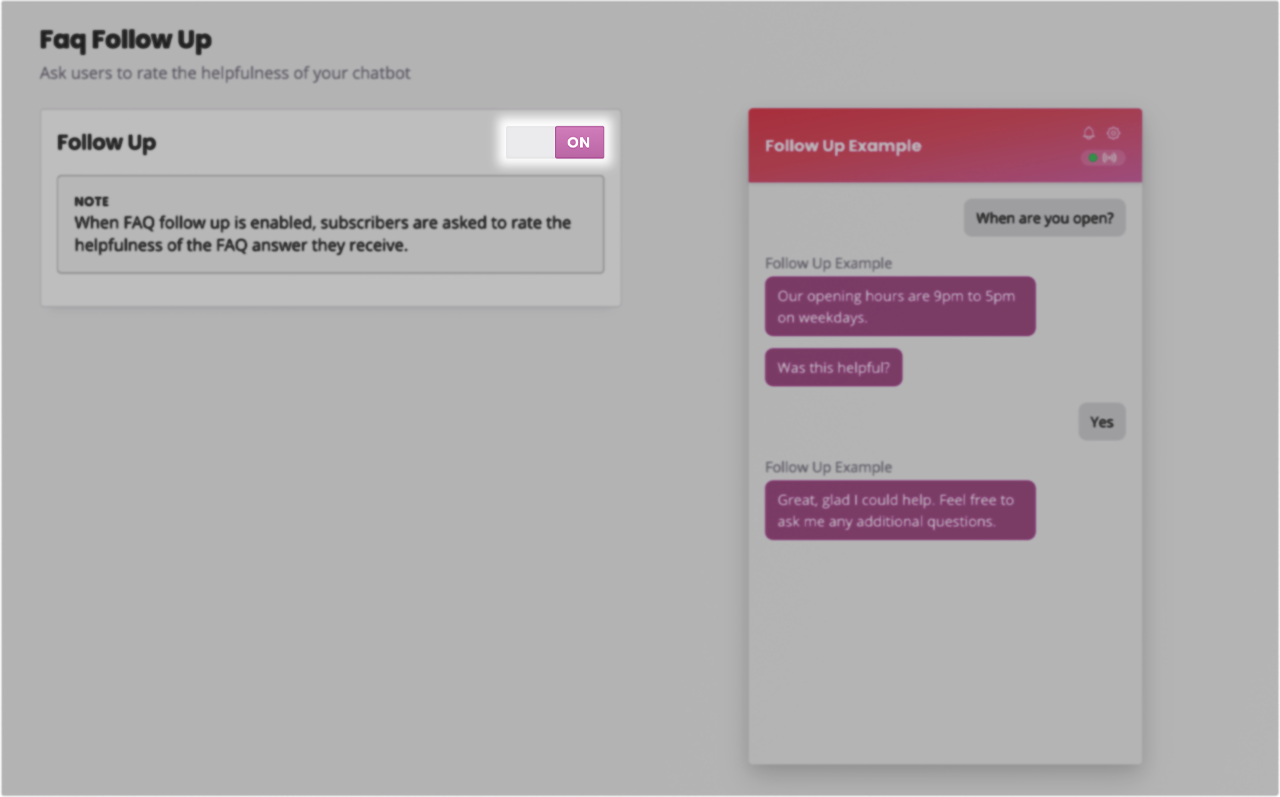 Most frequently, the FAQ follow-up is used to gather feedback from the user on the usefulness of the message they’ve just received.